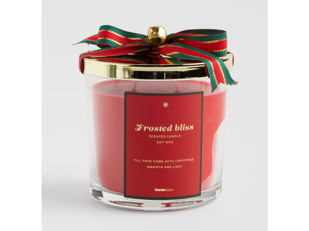 Oslávte Vianoce s touto elegantnou vonnnou sviečkou Frosted Bliss. Sviečka je umiestnená v priehľadnom sklenenom pohári, no vosk má sýtu červenú farbu a dlhú dobu horenia (31 h). Vonkajší povrch pohára zdobí vianočná potlač so zlatými prvkami a vrchná časť je uzavretá zlatým kovovým viečkom a previaznutá tradičnou károvanou stuhou, ktorá pripomína tradičný vianočný motív. Sviečka šíri kvetinovú a sviatočnú vôňu a stane sa krásnym a hrejivým doplnkom každého vianočného interiéru.