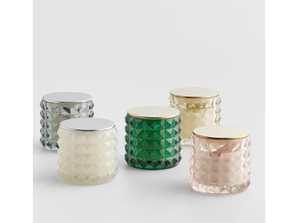 Materiál: farbené sklo, vôňa, kov s povrchovou úpravou, parafín, sójový vosk, syntetický kaučuk