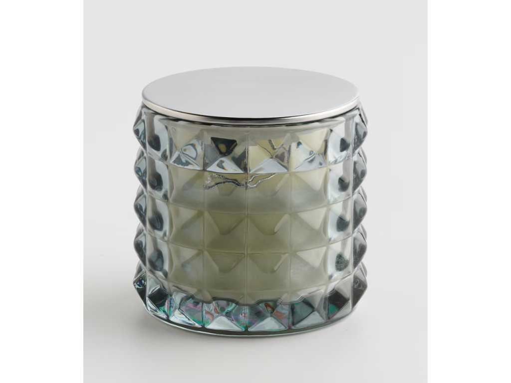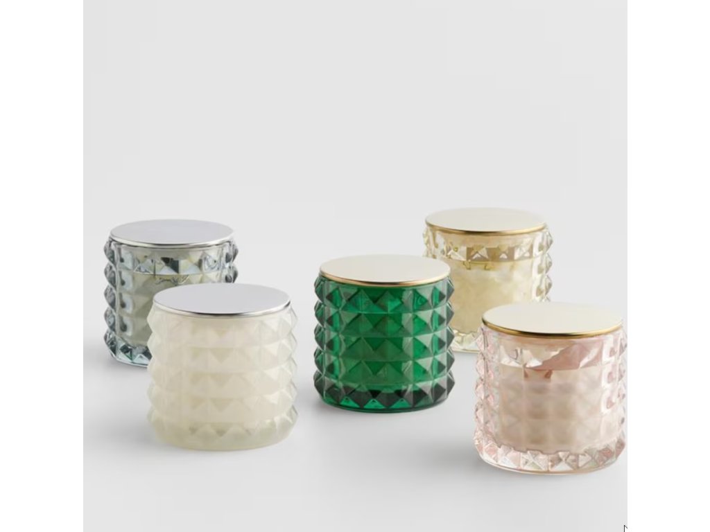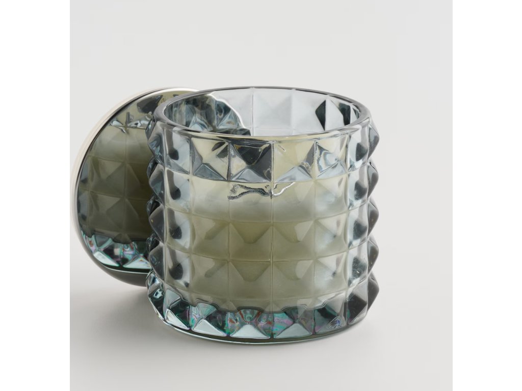 Materiál: farbené sklo, vôňa, kov s povrchovou úpravou, parafín, sójový vosk, syntetický kaučuk