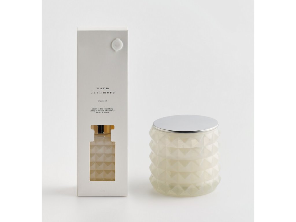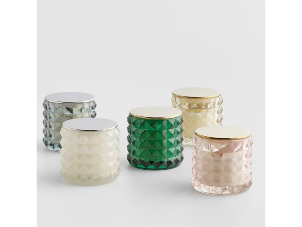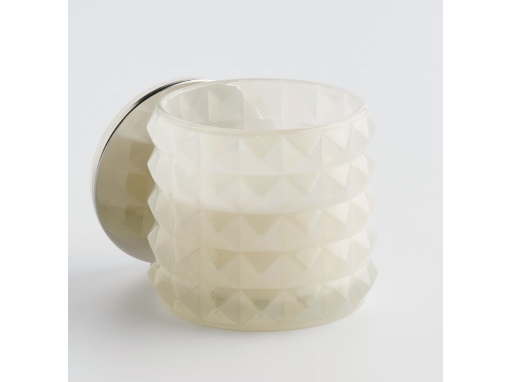 Materiál: farbené sklo, vôňa, kov s povrchovou úpravou, parafín, sójový vosk, syntetický kaučuk