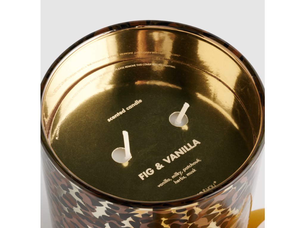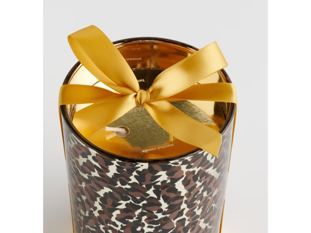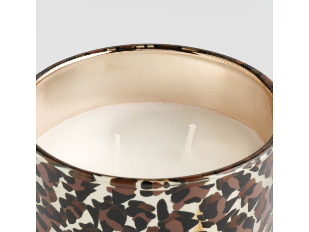 Vonnná sviečka v skle, ozdobená hnedými škvrnami v štýle pantera, je jedinečný doplnok, ktorý vnesie do interiéru teplú atmosféru a príjemnú vôňu. Spája v sebe estetiku s funkčnosťou a je ideálna do obývačky, spálne alebo kúpeľne.