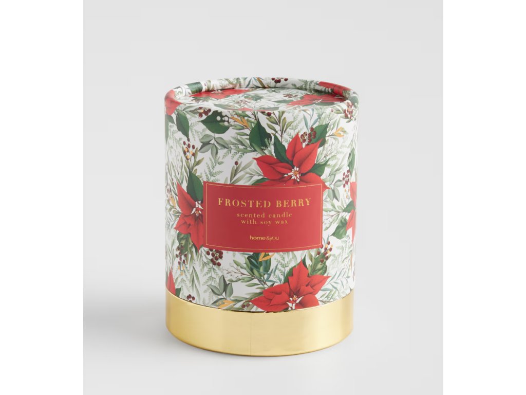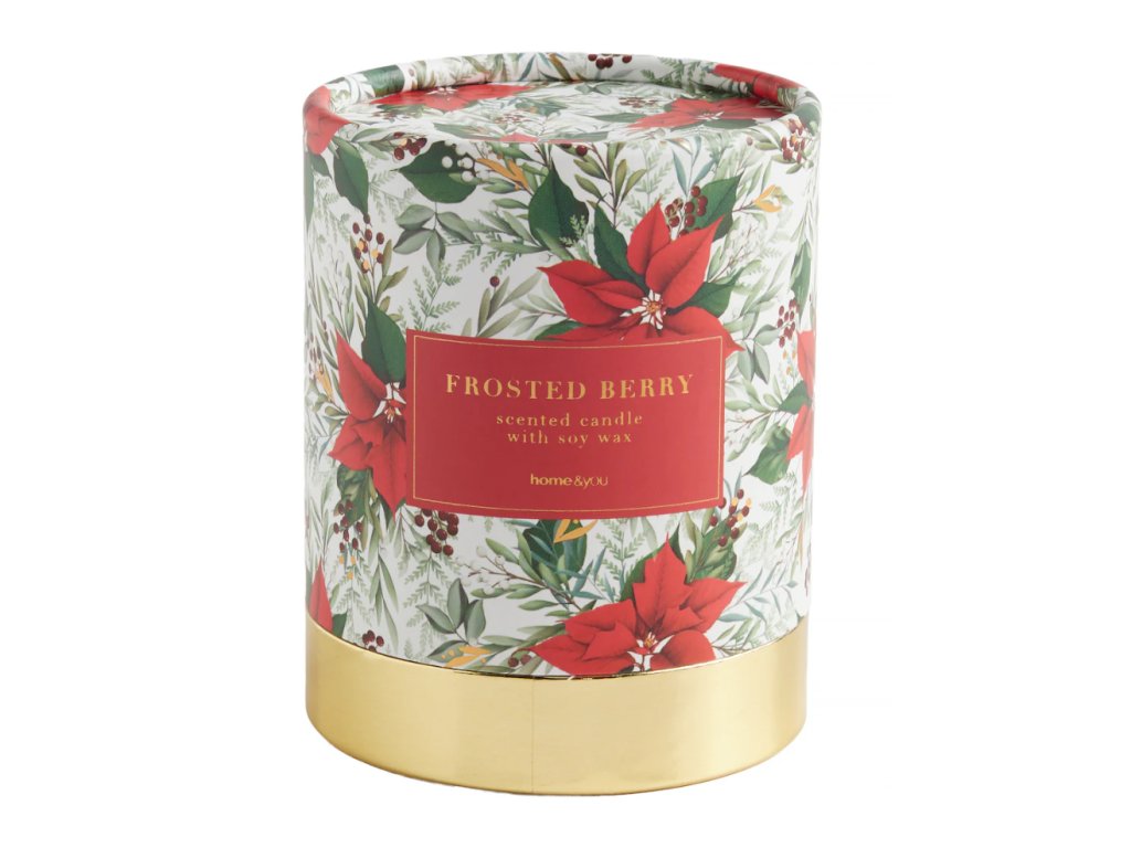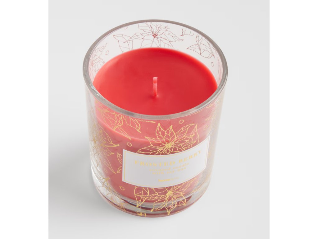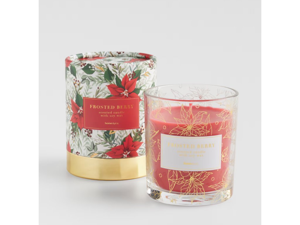 Rozžiarte svoj domov sviatočnou arómou a elegantným dizajnom s vonnnou sviečkou Frosted Berry. Sviečka je umiestnená v priehľadnom sklenenom pohári, ktorý je po obvode bohato zdobený zlatou potlačou s prepracovaným motívom vianočnej hviezdy (Poinsettie). Vosk vo vnútri má sýtu červenú farbu, ktorá v kombinácii so zlatým písmom a potlačou vytvára luxusný a tradičný akcent. Táto sviečka je vyrobená zo zmesi parafínu a sójového vosku a so dobou horenia 33 h prinesie dlhotrvajúcu, hrejivú atmosféru do každého interiéru. Vďaka priloženému dekoračnému baleniu je tiež ideálnym a vkusným vianočným darčekom.