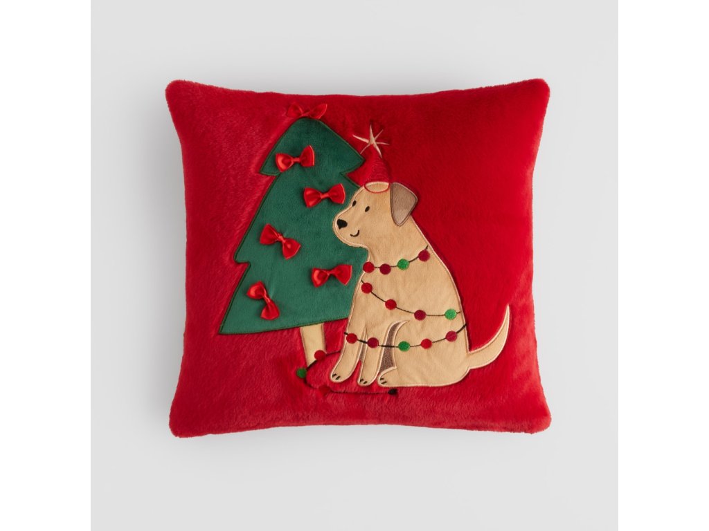 Intenzívna červená farba, ozdobná sviatočná aplikácia s motívom psíka a vianočného stromčeka a prepracované detaily, ako sú mašličky či svetielka, dodávajú obliečke výnimočný charakter.