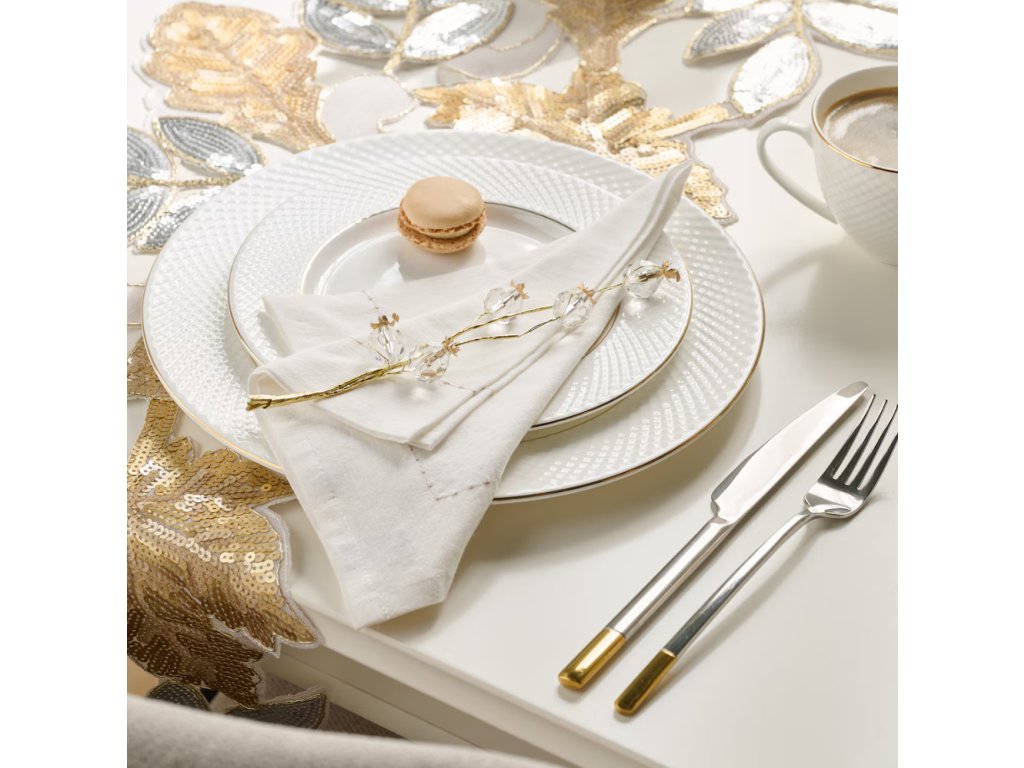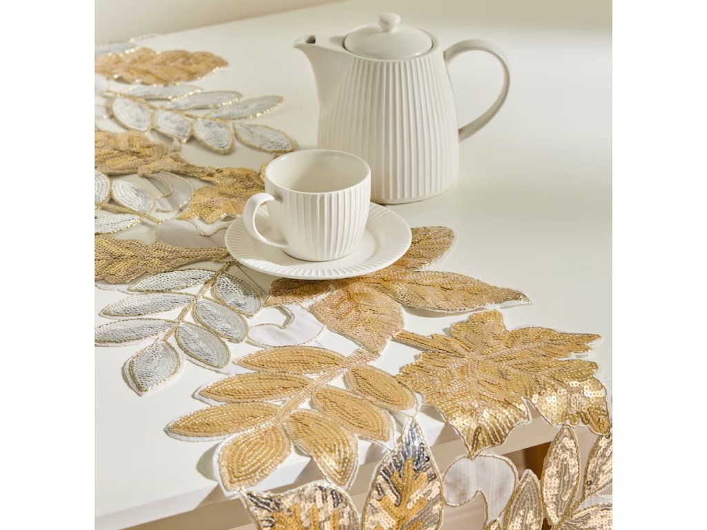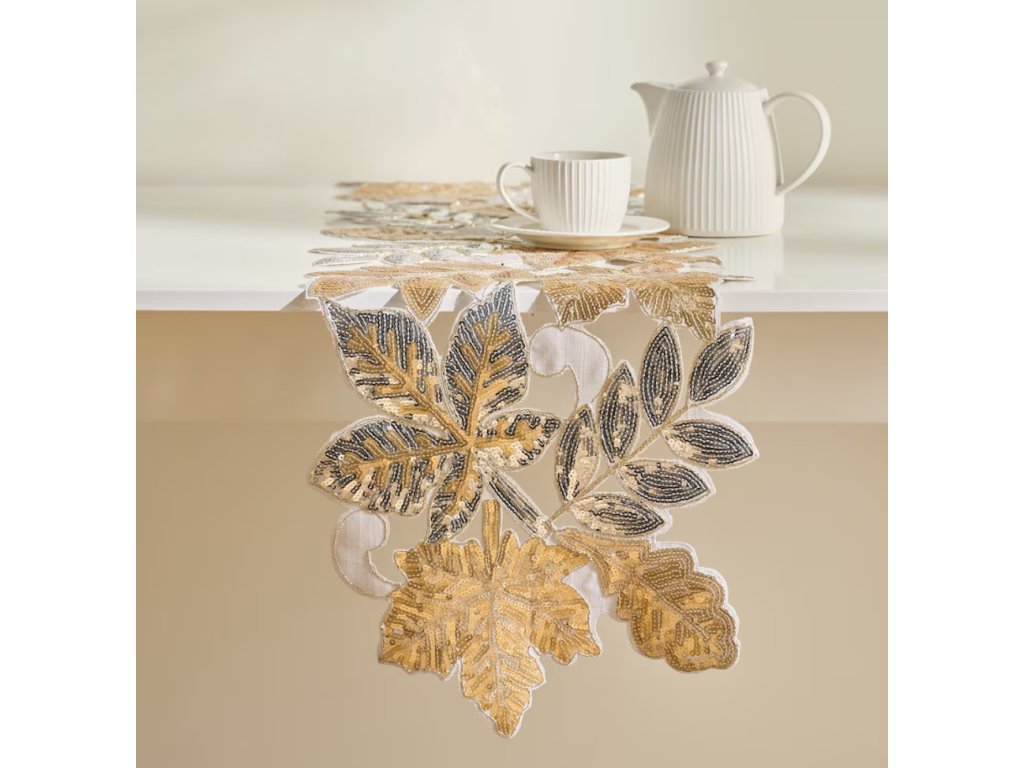 Elegantný vyšívaný behúň v slnečnej žltej farbe je efektný doplnok, ktorý rozžiari každý interiér. Je vyrobený z odolného materiálu, kombinuje dekoračný charakter s praktickým využitím. Materiál sa ľahko udržiava a je odolný voči pokrčeniu. Starostlivo vyhotovená výšivka mu dodáva ľahkosť a decentný šarm, čím zvýrazňuje jedinečný charakter stola. Dokonale sa hodí na každodenné použitie, ako aj na slávnostné príležitosti.