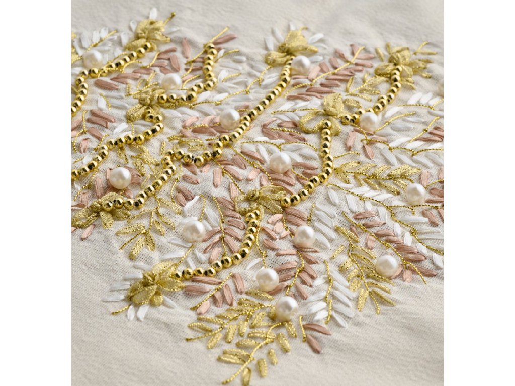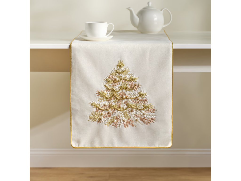 Krémový základ tkaniny, obohatený výšivkou v podobe dekoratívneho vianočného stromčeka so zlatými, perleťovými akcentmi a elegantným obšitím, vytvára nadčasovú, sviatočnú atmosféru v každom interiéri. Zlatý lesk a trojrozmerné detaily zaručujú, že behúň vyzerá skvele tak v klasických, ako aj moderných aranžmánoch. Je to nielen funkčná dekorácia, ale aj skvelý nápad na darček pre milovníkov výnimočných bytových doplnkov.