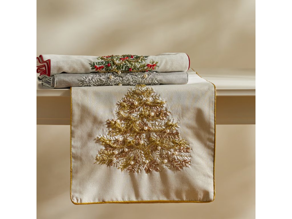 Dodajte svojmu stolu výnimočnú eleganciu a sviatočný lesk – vyšívaný behúň Arvore ({40 x 180 cm) podčiarkne charakter každej rodinnej oslavy a dodá triedu vašim aranžmánom.