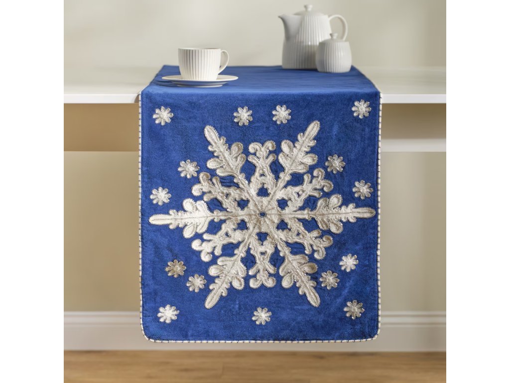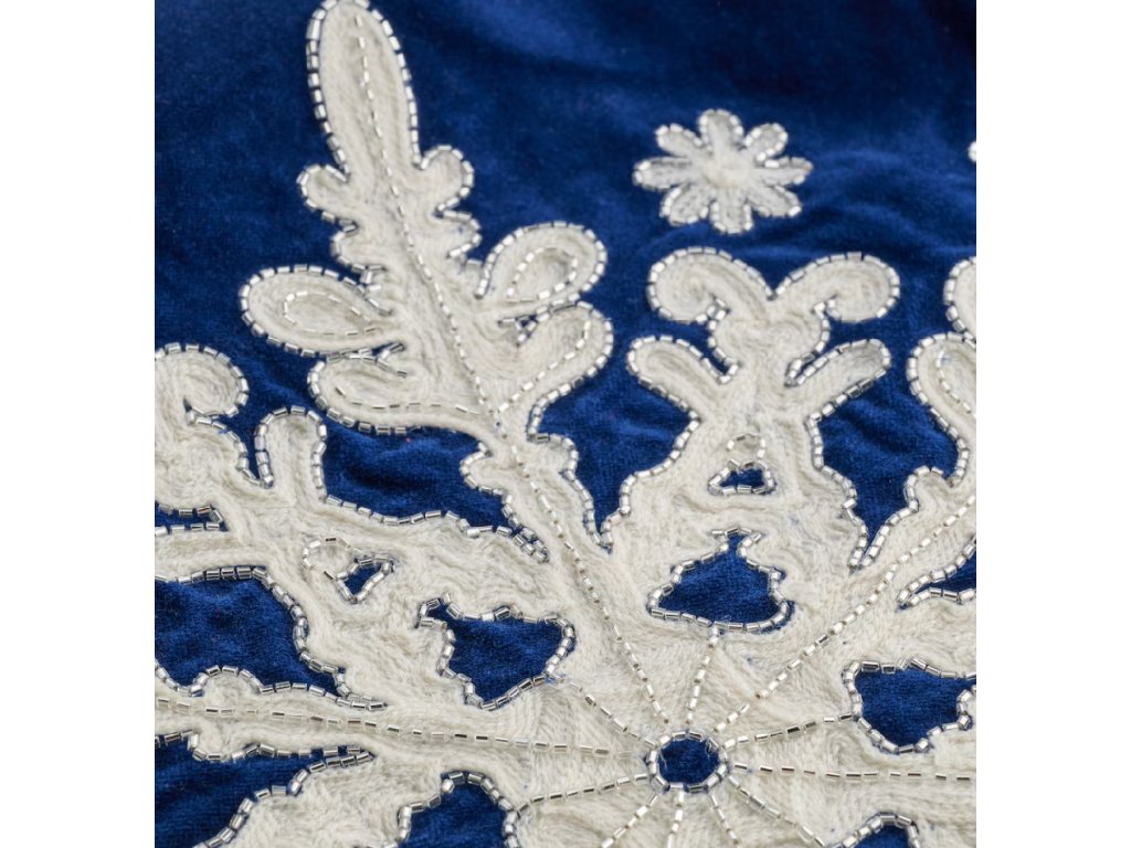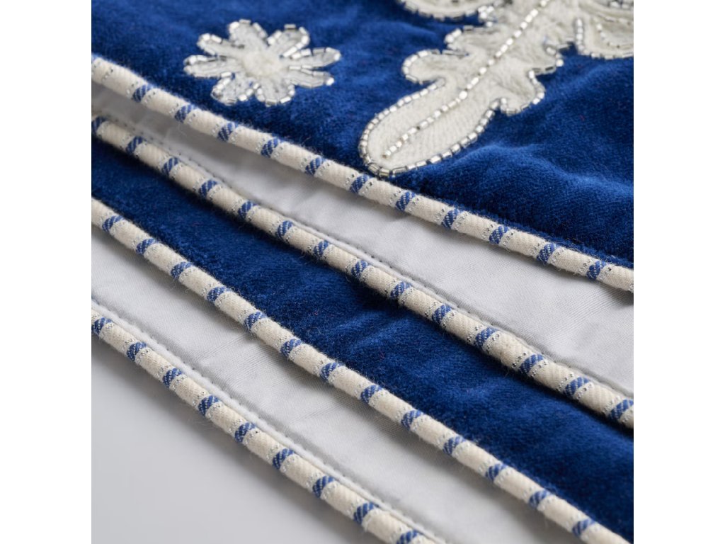 Intenzívna tmavomodrá farba tvorí elegantný základ pre dekoratívne výšivky snehových vločiek v odtieni lámanej bielej a strieborné koráliky s lesklými niťami. Starostlivo obšité okraje zdobí lemovka s jemným modrým pásikavým vzorom, ktorá podčiarkuje vysokú kvalitu vyhotovenia. Takýto dizajn sa skvele hodí do klasického, zimného alebo sviatočného prestierania stola, ale rovnako dobre doplní moderné interiéry. Je to tiež vynikajúca voľba na darček pre milovníkov štýlových dekorácií.