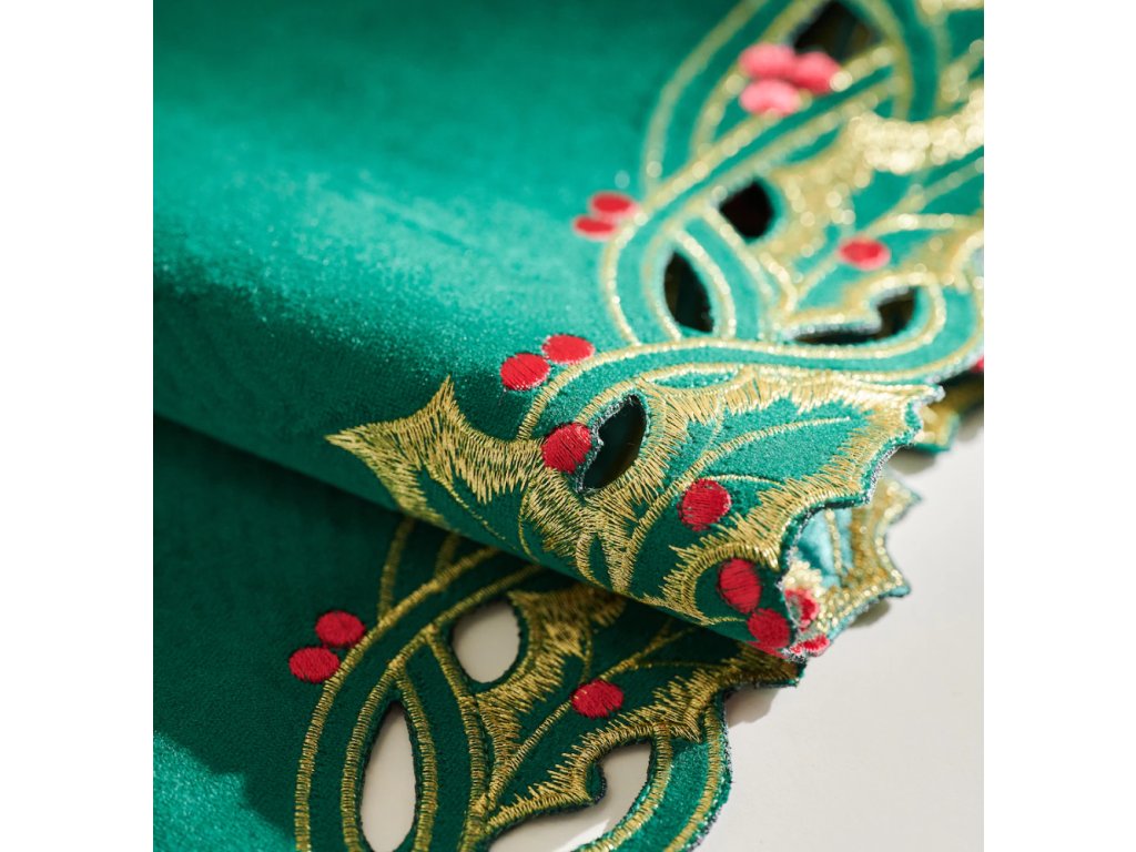 Intenzívna zelená farba a bohatá výšivka znázorňujúca listy cezmíny a červené bobule tvoria sviatočnú kompozíciu, dodávajúc interiéru výnimočný charakter. Zlatisté nite, starostlivo vyhotovené okraje a výrazne vypuklý vzor spôsobujú, že behúň priťahuje pohľady a dokonale sa prezentuje tak v klasických, ako aj moderných aranžmánoch. Je to ideálna ozdoba na stôl v jedálni či obývacej izbe a vynikajúca voľba na darček, najmä počas vianočného obdobia.