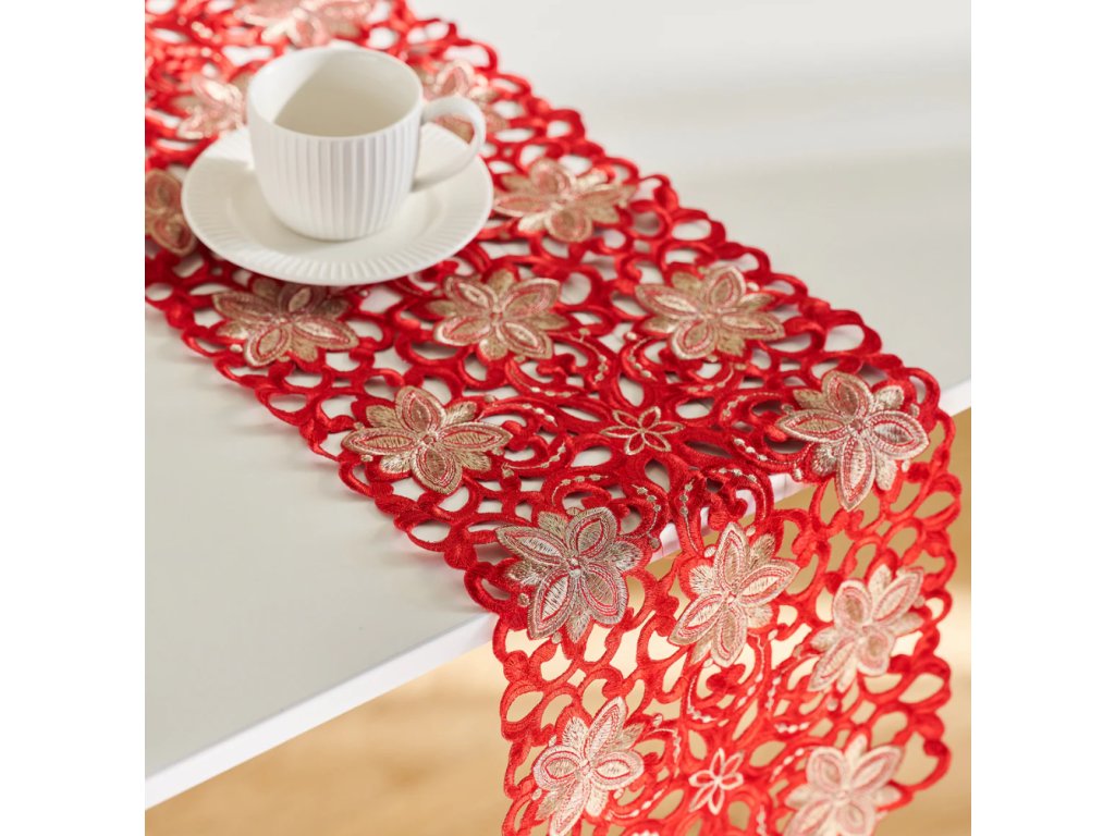 Uveďte výnimočnú atmosféru do svojho domova s vyšívaným behúňom Recor 28x174 cm. Intenzívna červená farba a zlaté výšivky sú zárukou nezabudnuteľných aranžmánov na vašom stole.