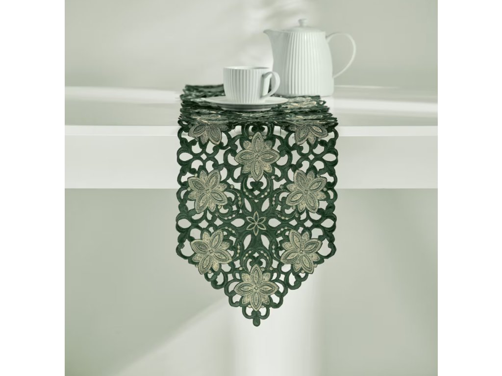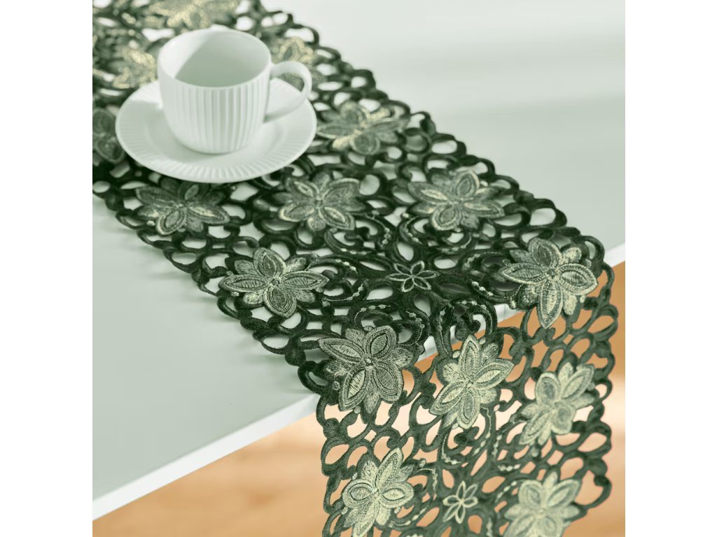Hlboká, tmavozelená farba a čipkovaný, rastlinný motív s vyrezávanými kontúrami listov a kvetov zabezpečujú, že behúň Recor dokonale zapadne do elegantných, klasických aj moderných aranžmánov. Precízne spracovanie dodáva jemnú ľahkosť a luxusný charakter každému stolu – od sviatočných hostín po každodonné stretnutia s blízkymi. Je to tiež nápad na praktický darček, ktorý poteší milovníkov krásnych a funkčných doplnkov do domácnosti.
