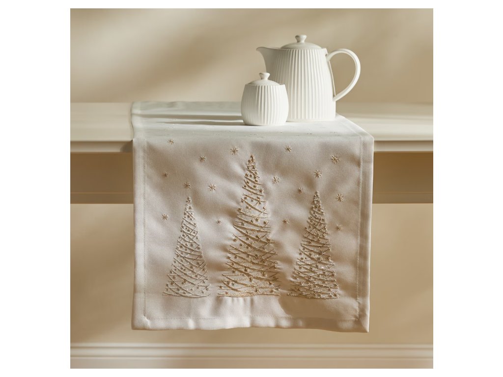 Snežnobiela farba behúňa s precízne vyšitými zlatými vianočnými stromčekmi a drobnými hviezdičkami je kvintesenciou sviatočnej elegancie. Precízne vyhotovenie a subtílny lesk materiálu podčiarknu výnimočnú atmosféru stola – tak počas rodinných stretnutí, ako aj na každý deň. Behúň pasuje do klasických a moderných interiérov, pričom predstavuje aj vynikajúci nápad na darček pre blízkych.