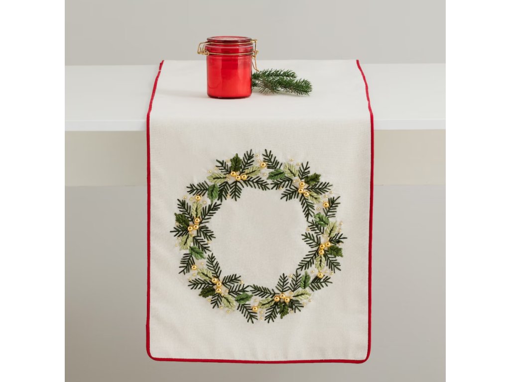 Dominantným prvkom je precízne vyhotovený vianočný veniec, ktorý kombinuje rôzne odtiene zelenej farby ihličia a listov. Výšivka je navyše zdobená trblietavými zlatými korálkami, ktoré imitujú vianočné bobule alebo ozdoby, a vytvárajú tak luxusný, ale hrejivý dojem. Kontrastný červený lem pozdĺž okrajov dodáva behúňu výraz a dokonale ho vizuálne ohraničuje. Vďaka svojej kombinácii béžovej, zelenej a červenej farby je tento behúň ideálnym doplnkom pre tradičné i rustikálne vianočné dekorácie. Je vyrobený z kvalitnej zmesi materiálov, vrátane polyesteru a bavlny, čo zaisťuje jeho trvácnosť a dlhú životnosť.