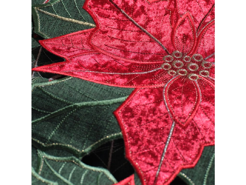Červená farba s vyšívaným, okázalým motívom poinsettie a zelenými listami priťahuje zrak a podčiarkuje sviatočnú auru. Klasický, elegantný vzor sa skvele hodí k tradičným, glamour a moderným aranžmánom – osvedčí sa tak na sviatočnom stole, ako aj počas rodinných slávností. Je to výnimočný doplnok a nápad na darček s nadčasovou estetikou.