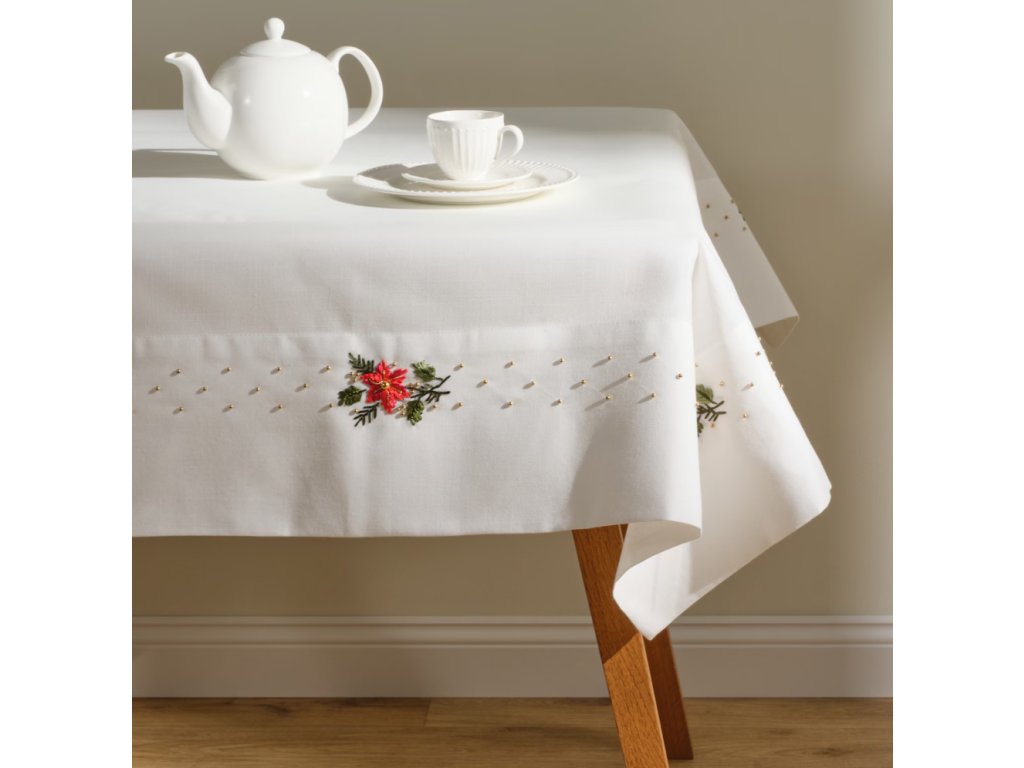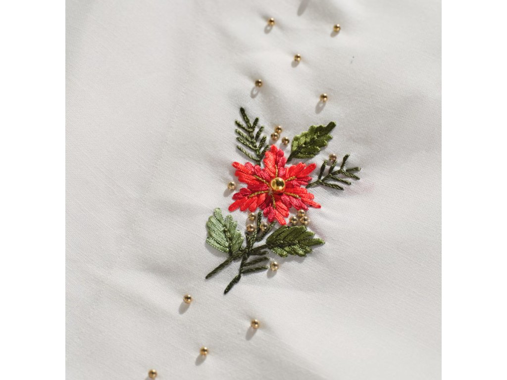 Biely obrus z kvalitnej látky predstavuje decentnú a elegantnú výzdobu pre váš sviatočný stôl. Okraje obrusu sú zdobené minimalistickým pásom jemnej výšivky s motívom červenej vianočnej hviezdy a drobnými zlatými perličkami, ktoré dodávajú jemný lesk. Tento biely obrus vnáša do interiéru čistú a slávnostnú atmosféru, pričom sa hodí do moderného aj tradičného aranžmánu
