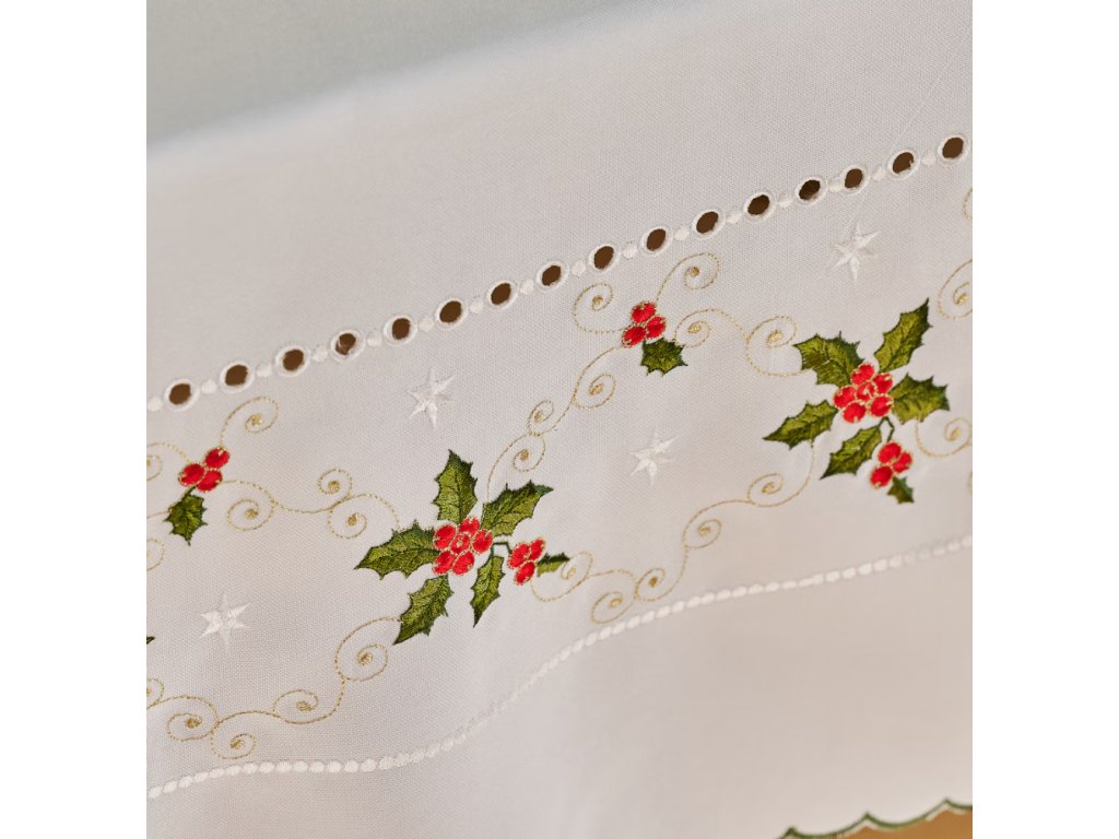 Základ v klasickej bielej farbe, obohatený precíznou výšivkou s motívmi cezmíny s červenými bobuľami, zlatými líniami a jemnými hviezdami, vnáša do interiéru skutočne sviatočnú atmosféru. Vlnité, prelamované okraje so zeleným lemovaním a starostlivé vyhotovenie spôsobujú, že obrus dokonale zapadá do tradičných alebo elegantných aranžmánov. Ideálne sa hodí na štedrovečernú večeru, rodinný obed, ako aj ako výnimočný sviatočný darček.