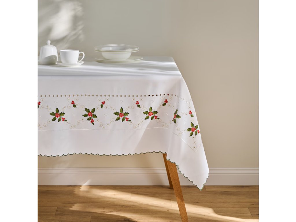 Vytvorte si výnimočnú náladu počas sviatočných stretnutí s vyšívaným obrusom Merrila 147x220 cm. Tento elegantný obrus v bielej farbe s dekoratívnou sviatočnou výšivkou okamžite zvýrazní váš stôl, podčiarkujúc rodinný charakter spoločných chvíľ.