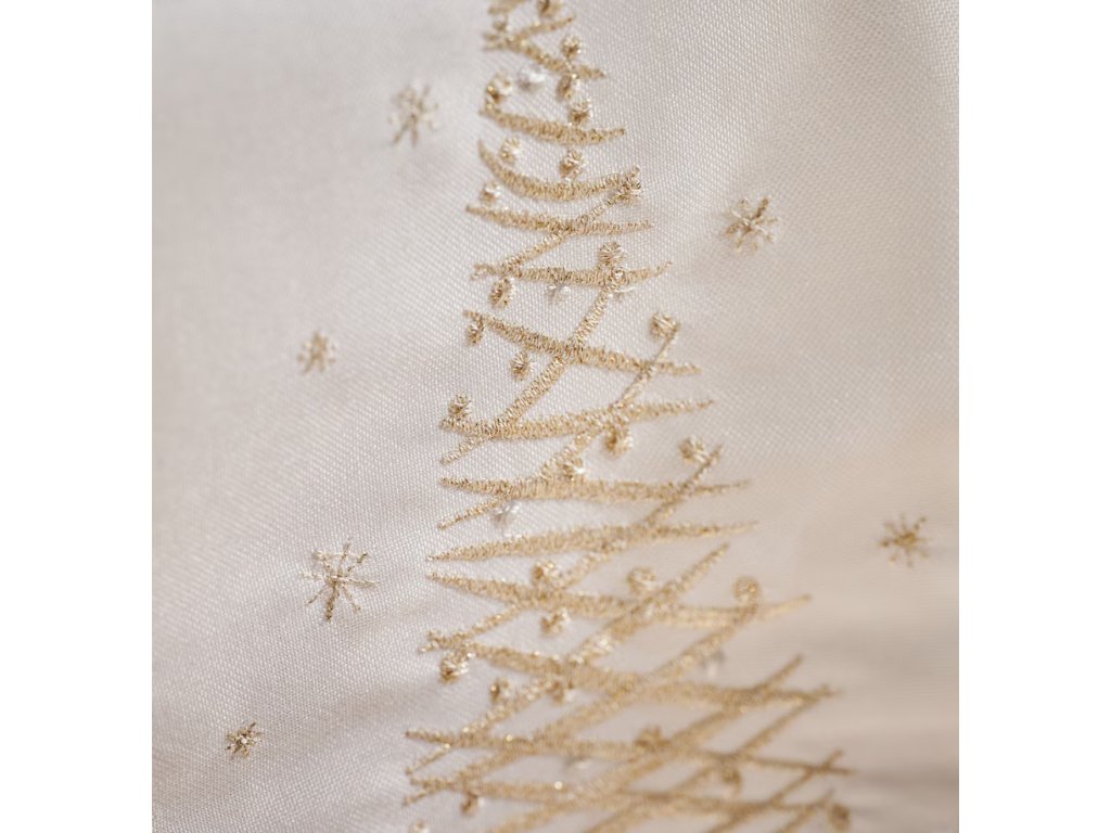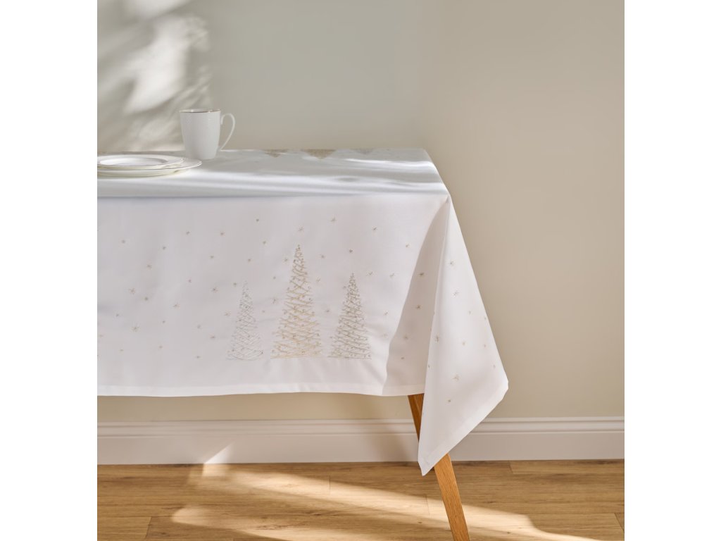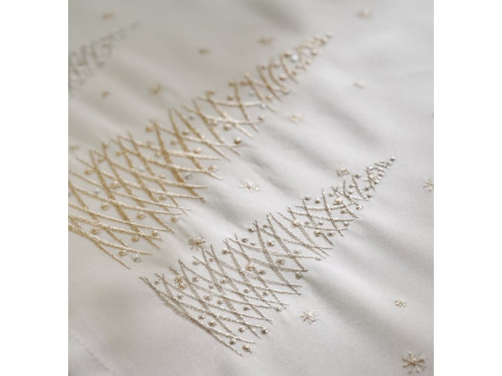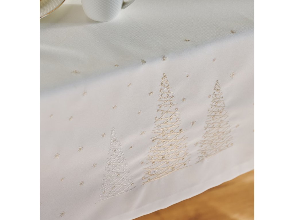 Vyšívaný obrus Navore v bielom plátne s decentnými zlatými detailmi vytvorí na vašom stole jemnú a elegantnú vianočnú atmosféru. Na obruse sú vyšívané motívy štylizovaných vianočných stromčekov a drobných hviezdičiek, ktoré mu dodávajú slávnostný nádych. Tento obrus, ideálny pre sviatočné stolovanie, kombinuje praktickosť polyesterového materiálu s klasickým a nadčasovým dizajnom.
