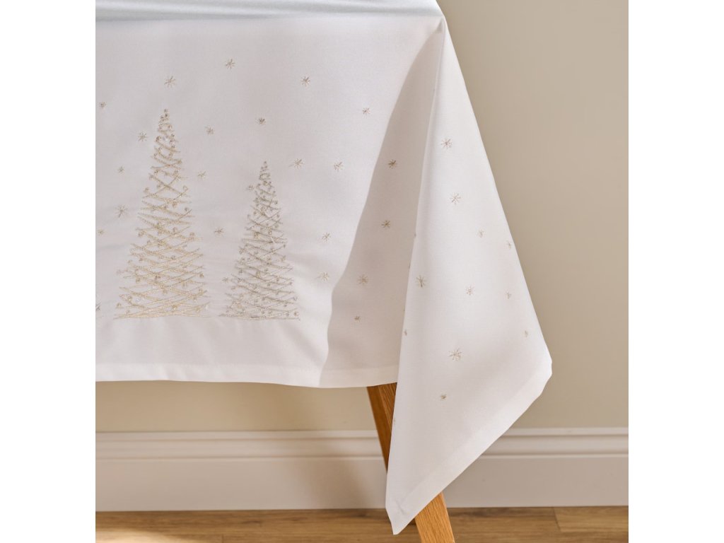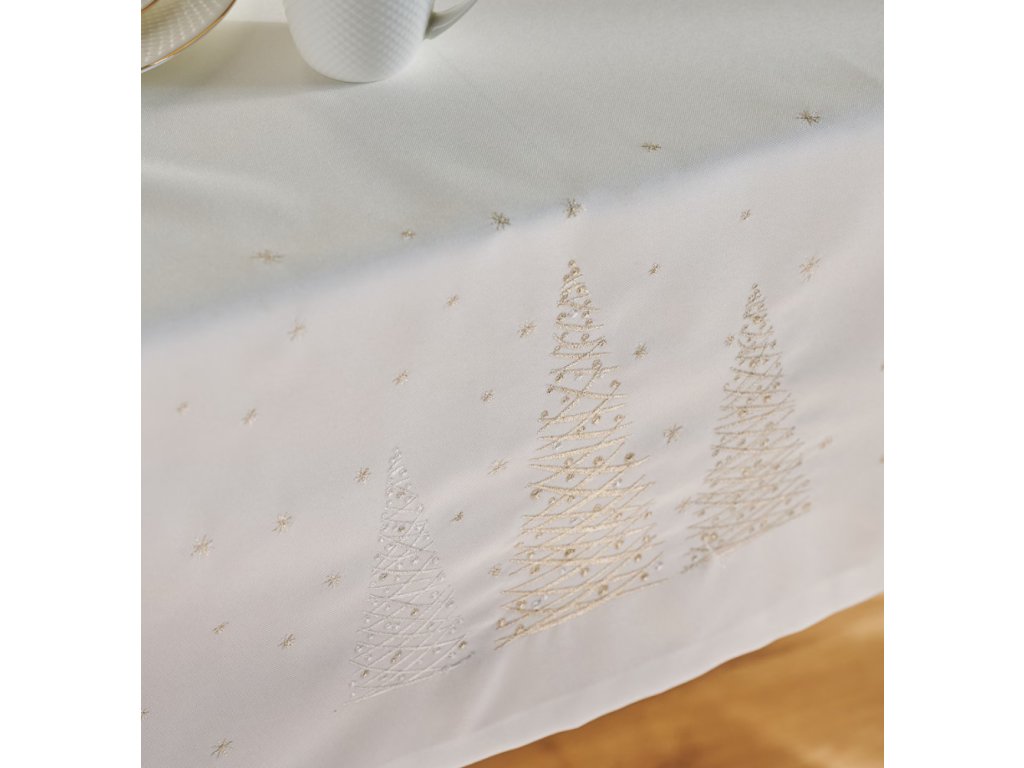 Vyšívaný obrus Navore v bielom plátne s decentnými zlatými detailmi vytvorí na vašom stole jemnú a elegantnú vianočnú atmosféru. Na obruse sú vyšívané motívy štylizovaných vianočných stromčekov a drobných hviezdičiek, ktoré mu dodávajú slávnostný nádych. Tento obrus, ideálny pre sviatočné stolovanie, kombinuje praktickosť polyesterového materiálu s klasickým a nadčasovým dizajnom.