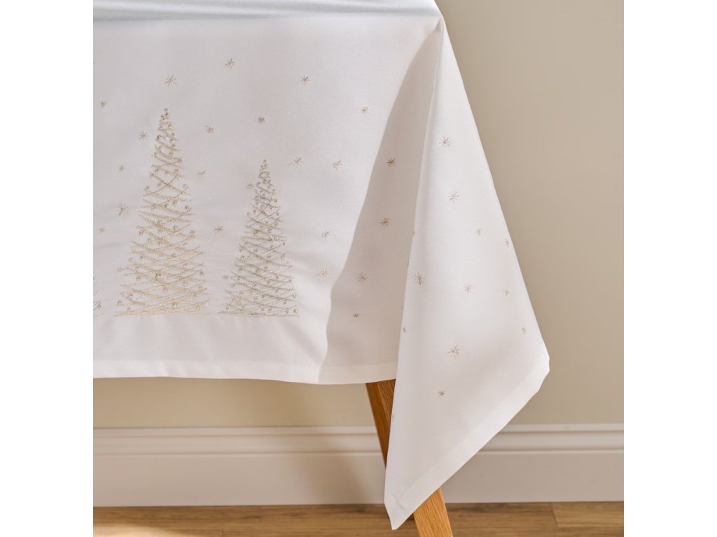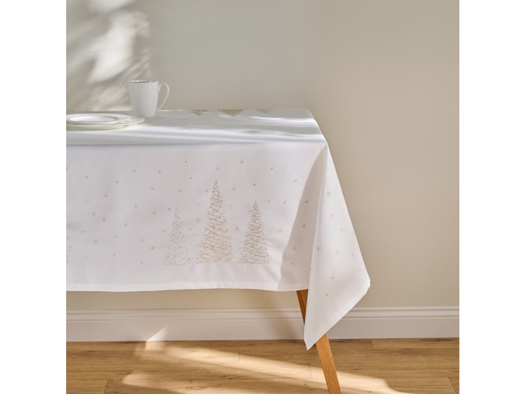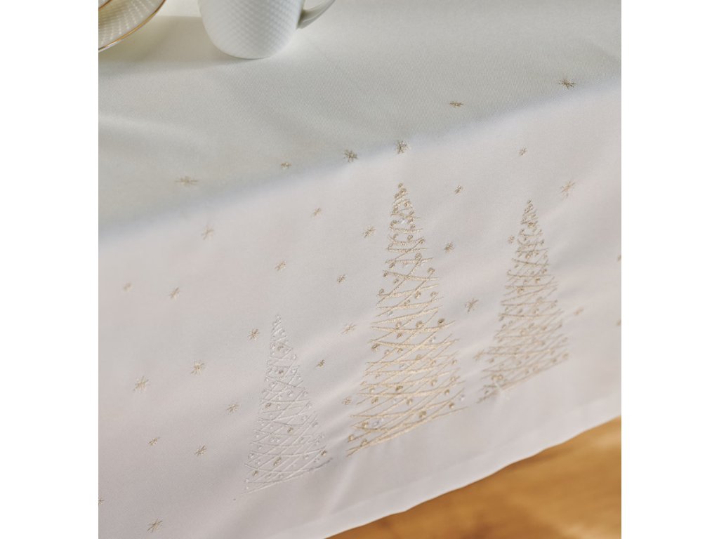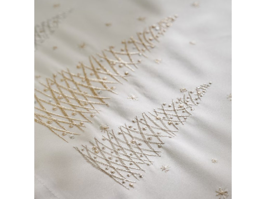 Vyšívaný obrus Navore vnesie do vášho domova sviatočnú eleganciu a teplo. Na bielom podklade z polyesterového plátna sa vynímajú jemné výšivky vianočných stromčekov a drobných hviezd, ktoré dodajú vášmu stolu slávnostný nádych. Tento obrus, s rozmermi 150x360 cm, je ideálny na dlhé sviatočné stoly a vytvára dokonalé pozadie pre rodinné stretnutia a sviatočné hostiny. Jemné tóny a detailné spracovanie sú zárukou, že váš stôl bude vyzerať štýlovo a útulne.