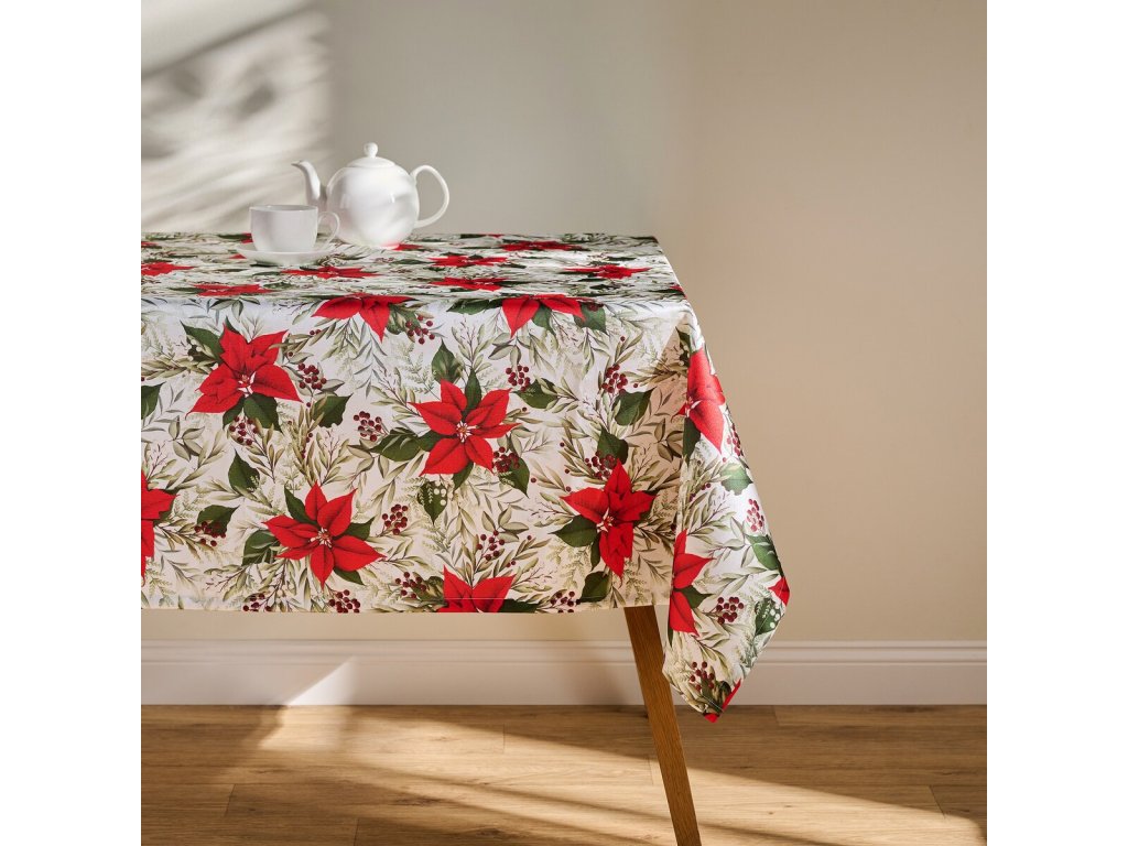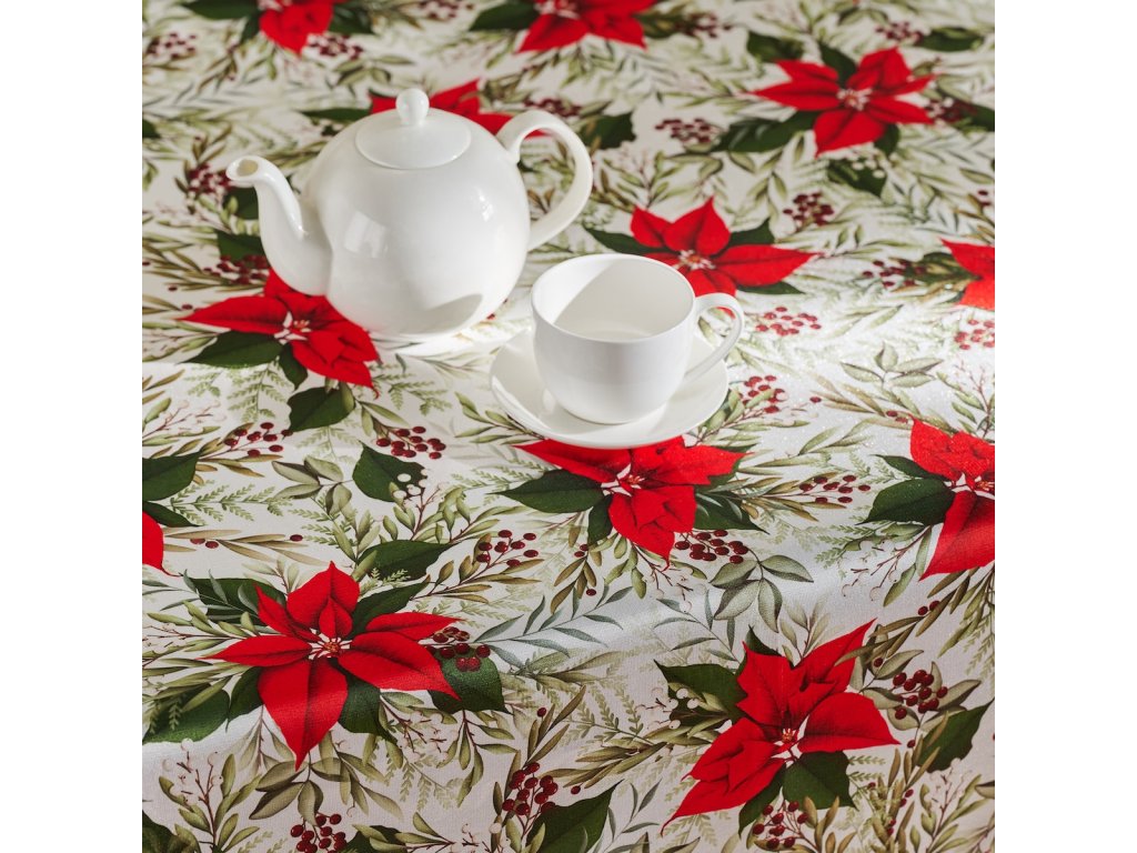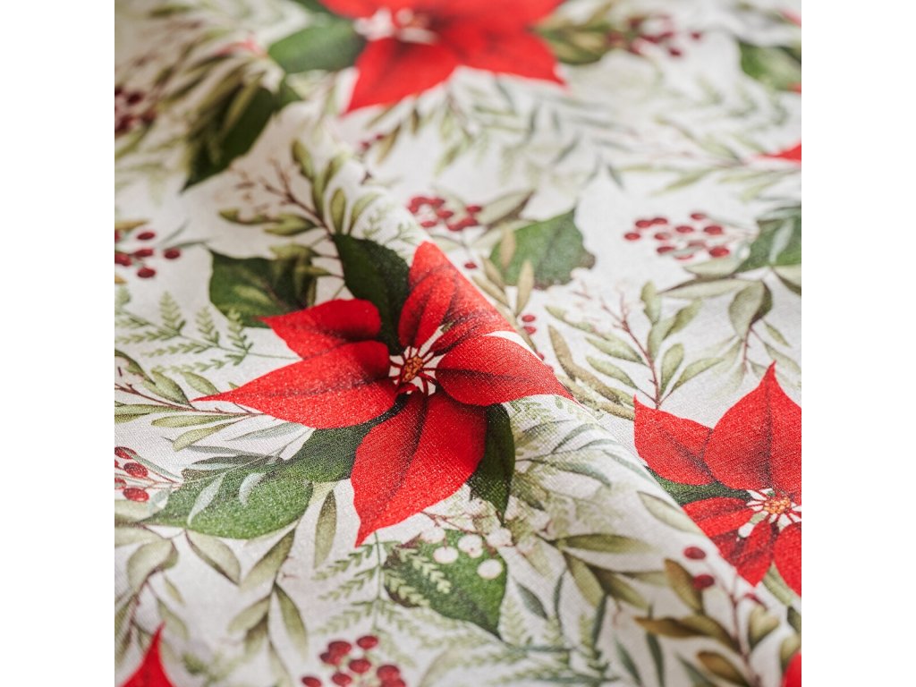 Obrus s potlačou Poinsetta prinesie na váš stôl tradičnú a intenzívnu sviatočnú atmosféru. Biely žakárový obrus s rozmermi 150x220 cm je pokrytý výraznou, fotorealistickou potlačou červených vianočných hviezd a zelene, čo okamžite premení váš jedálenský priestor na centrálnu scénu vianočných stretnutí. Je vyrobený zo 100% polyesteru, vďaka čomu je praktický a ľahko sa udržiava, a jeho elegantný vzor oslavuje klasický motív Vianoc.