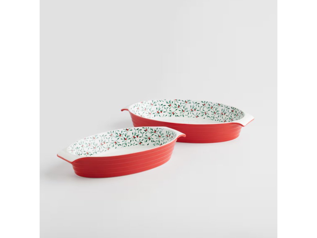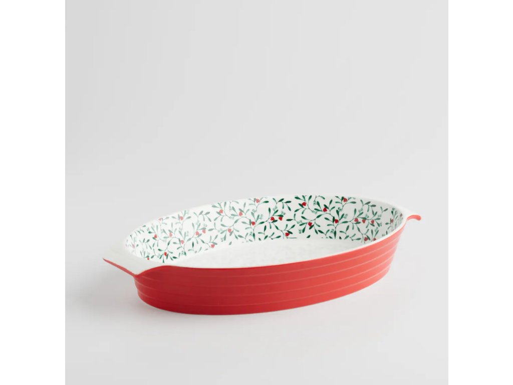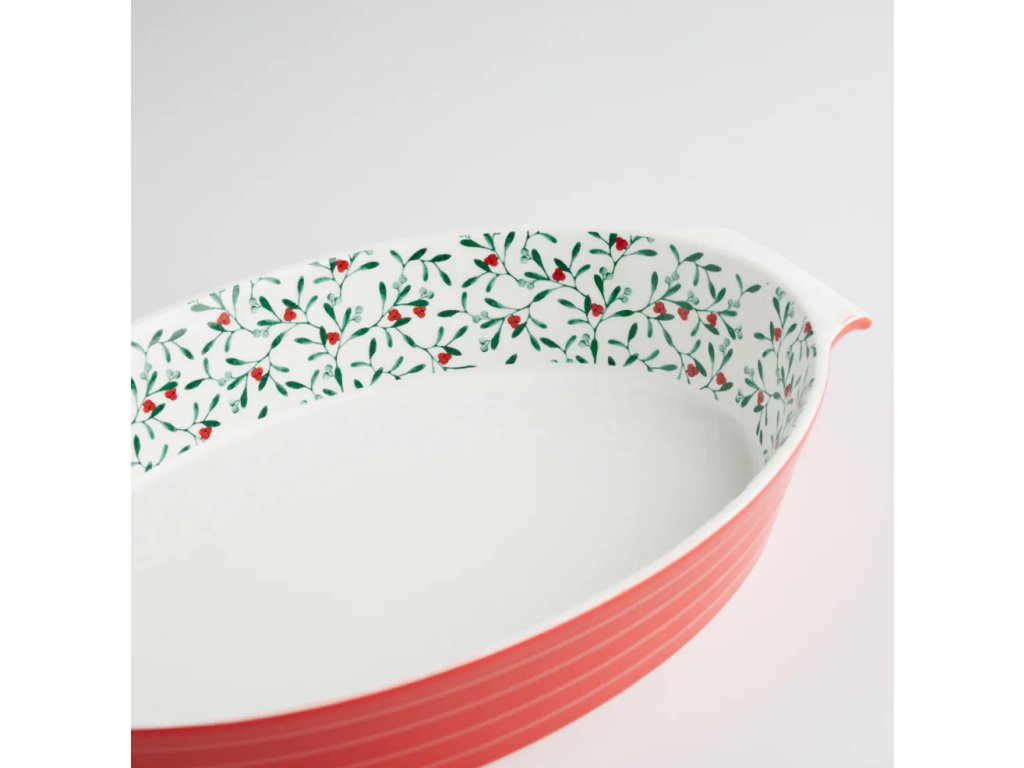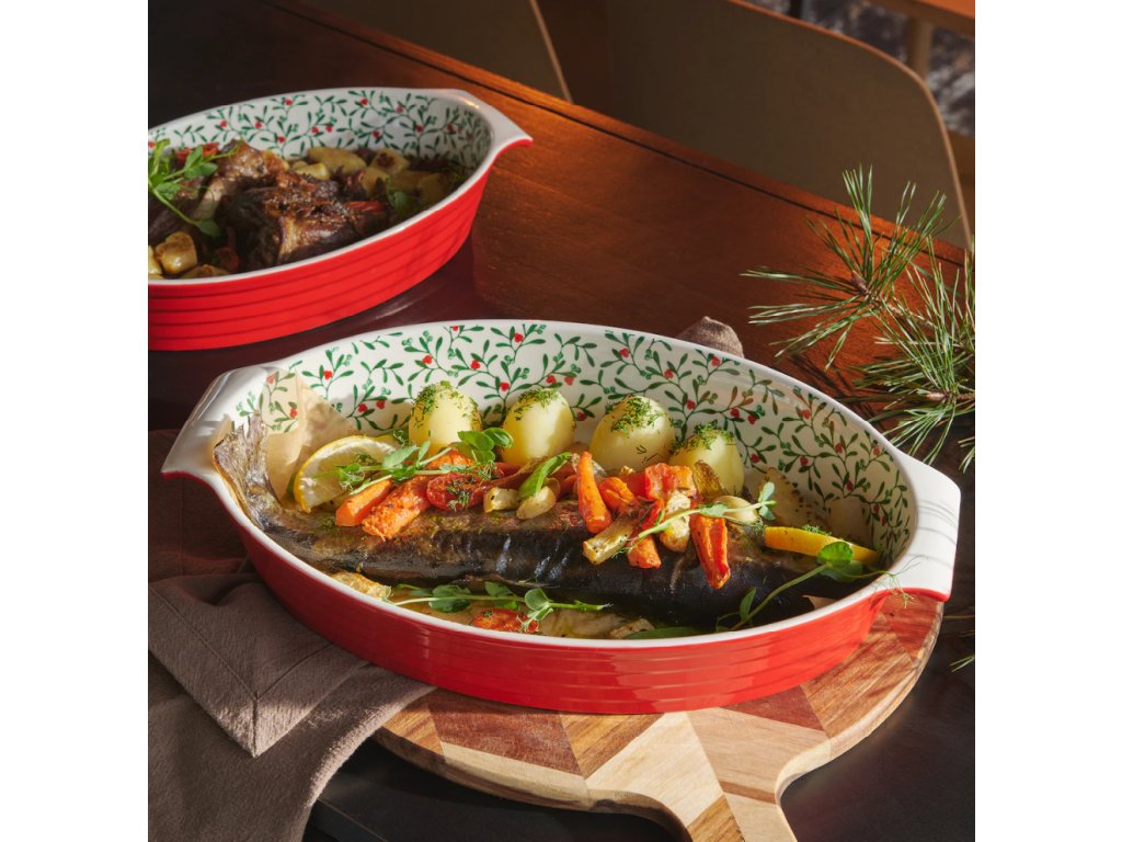 Táto elegantná misa spája funkčnosť a tradičnú estetiku. Má robustnú červenú vonkajšiu časť a vnútorný dekor s rastlinným motívom (imelo s červenými bobuľami), ktorý dodá vášmu stolu šarm. Vďaka odolnosti voči vysokým teplotám (260°C) je ideálna na prípravu a priame servírovanie lasagní, kastrólov, zapekaných zemiakov či iných slávnostných pokrmov.