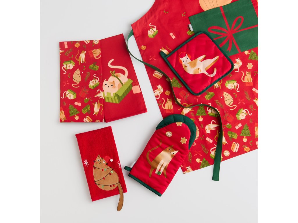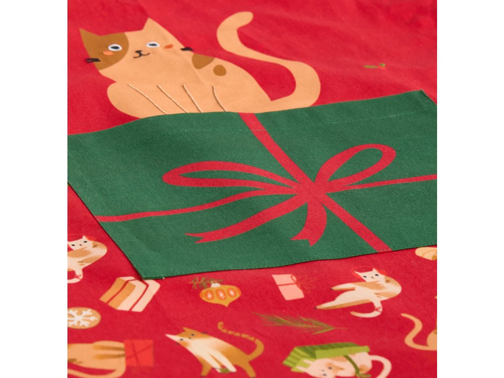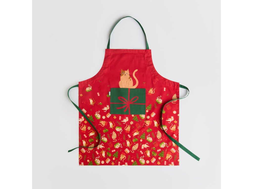 Intenzívna červená farba zástery s efektným sviatočným vzorom s mačkami, vianočnými stromčekmi a sladkosťami je nielen praktické, ale aj dekoratívne riešenie pre každú kuchyňu. Zelené vrecko s motívom mačky a ozdobnou mašľou podčiarkuje neobyčajný charakter produktu. Módny dizajn ideálne doplní aranžmány počas sviatočného obdobia a pri každodenných i slávnostných kulinárskych prípravách. Skvelý nápad na darček pre milovníka varenia a zvierat.