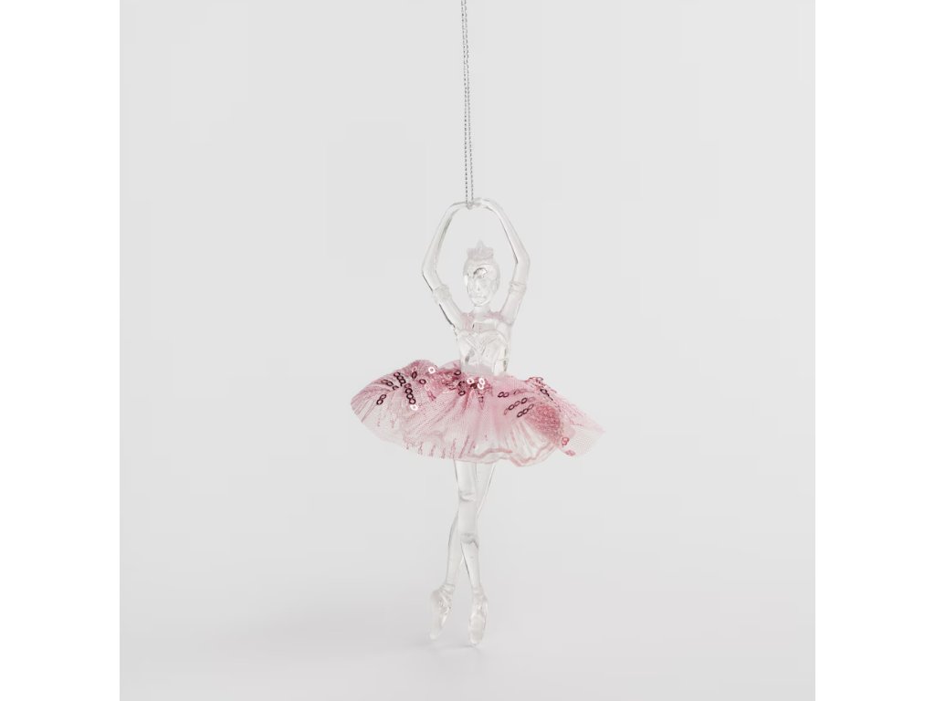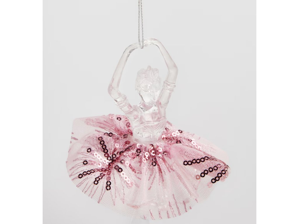 Ozdobte svoj vianočný stromček s gráciou a ľahkosťou, ktorú so sebou prináša táto rozprávková dekorácia. Táto závesná ozdoba v štýle glamour znázorňuje elegantnú baletku (výška ) v tanečnej póze. Telo baletky je vyrobené z transparentného, lesklého plastu, ktoré pôsobí ako krištáľ. Jej sukienka je vytvorená z nadýchanej svetlo ružovej tylovej látky (polyester), bohato zdobenej trblietavými flitrami. Táto dekorácia vnesie do priestoru jemnosť, ženskosť a nežný, sviatočný lesk. Je ideálnym darčekom pre milovníkov tanca a elegantných vianočných ozdôb.