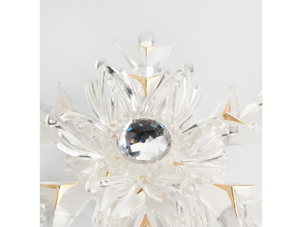 Zlatá ozdoba v tvare snehovej vločky je nádherným doplnkom pre vianočný stromček alebo zimnú dekoráciu. Ozdoba je vyrobená z plastu, zdobená jemnými detailmi a má výšku 4 cm. V strede ozdoby je umiestnený lesklý krištáľ, ktorý dodáva celku pôvab a nádych glamour štýlu. Jej lesklý povrch odráža svetlo a vnáša do interiéru slávnostnú a elegantnú atmosféru.
