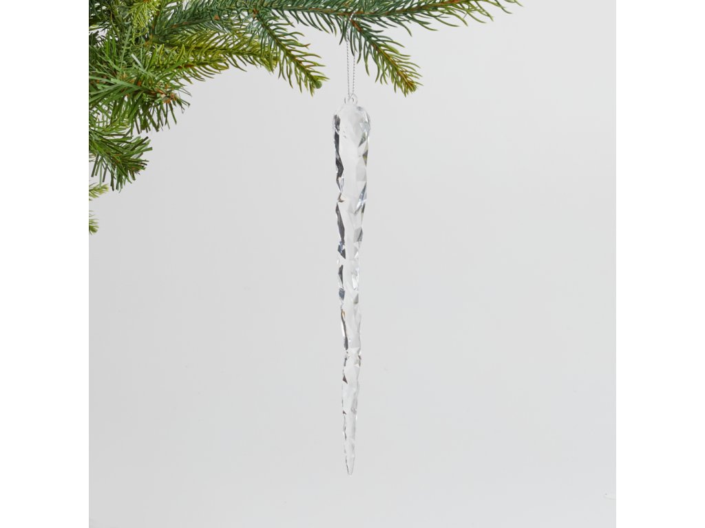 Táto závesná dekorácia v tvare cencúľa imituje ľadový kryštál a vnesie do interiéru mrazivú eleganciu. Je vyrobená z priehľadného materiálu s fazetovaným povrchom, ktorý odráža svetlo a vytvára efekt oslnivého lesku. Cencúľ visí na tenkej striebornej šnúrke a je ideálny na zavesenie na vianočný stromček, okno alebo ako súčasť zimnej aranžácie, kde dodá priestoru sofistikovaný a moderný dotyk.