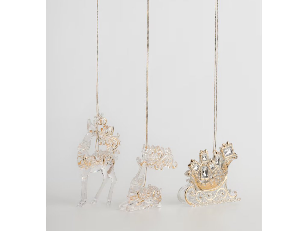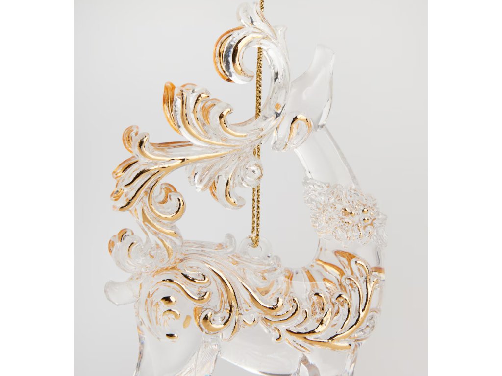 Ozdobte svoj vianočný stromček týmto nádherným sobom, ktorý vnesie do vášho interiéru kráľovský lesk a glamour. Táto závesná ozdoba je vyrobená z transparentného plastu a jej tvar je inšpirovaný vznešeným postojom soba so zdvihnutou hlavou (výška ). Je bohato zdobená trblietavým zlatým motívom v štýle barokových ornamentov, ktoré pokrývajú telo a vytvárajú majestátne parožie. Vďaka lesklej povrchovej úprave a zlatej šnúrke pôsobí ozdoba ako drahocenný krištáľ. Je ideálnou voľbou pre všetkých, ktorí hľadajú luxusné a sofistikované vianočné dekorácie.