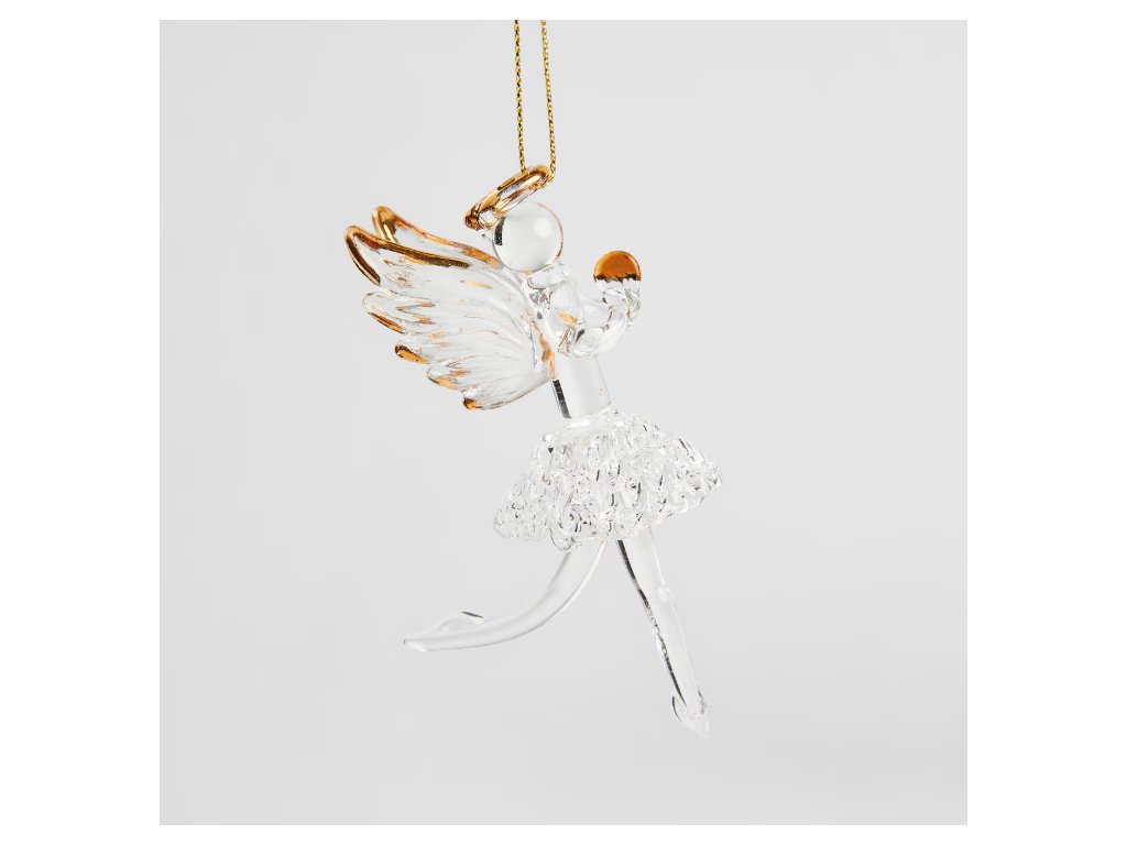 Táto závesná dekorácia je vyrobená z číreho skla v tvare tancujúceho alebo vznášajúceho sa anjela (výška ). Anjelik má sklenenú sukienku s jemne zdobeným reliéfom, ktorý zachytáva svetlo. K detailom patrí zlatá (alebo pozlátená) svätožiara a zlatom lemované krídla, ktoré vytvárajú elegantný kontrast s čírym sklom. V ruke drží malú zlatú guľu. Táto ozdoba v elegantnom štýle je zavesená na tenkej zlatej šnúrke a je ideálna pre vytvorenie jemnej, sofistikovanej a nadčasovej vianočnej výzdoby.