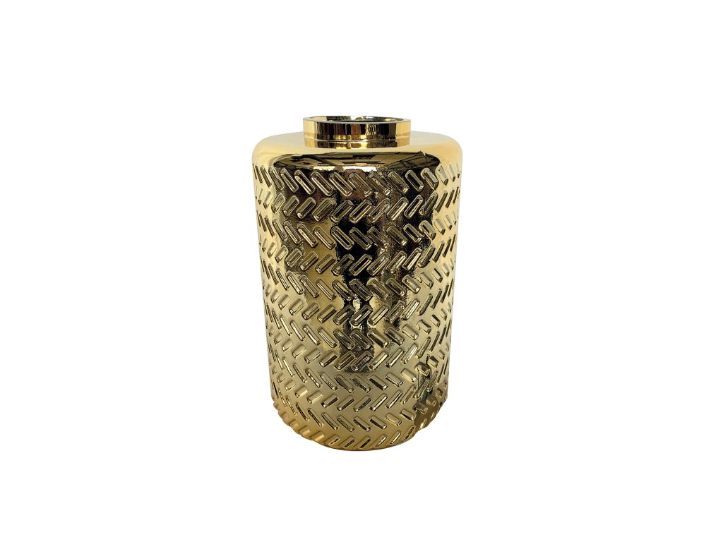 Dodajte Vášmu interiéru dotyk elegancie s našou zlatou vázou s textúrovaným reliéfnym vzorom.