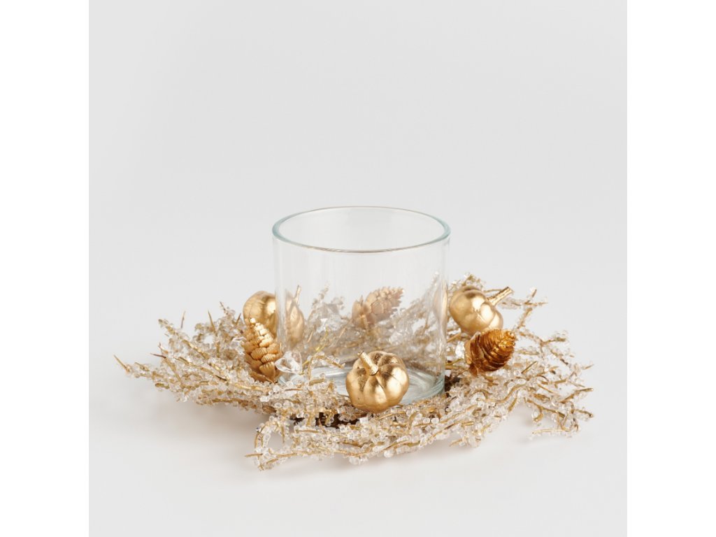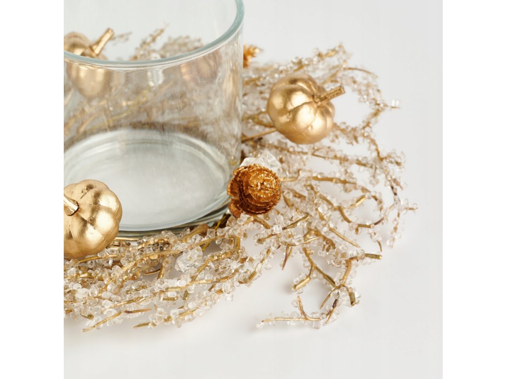 Tento elegantný dekoračný svietnik v štýle GLAMOUR je dokonalým doplnkom pre jesenné stolovanie. V jeho strede sa nachádza sklenený valec, ktorý je obklopený bohatým aranžmánom v tvare venca. Veniec tvoria zlaté vetvičky, lesklé pozlátené tekvice a šišky, ktoré sú doplnené o trblietavé kryštálové detaily. Svietnik dodá vášmu interiéru luxusný a slávnostný nádych, ideálny na vytvorenie teplej a útulnej atmosféry.
