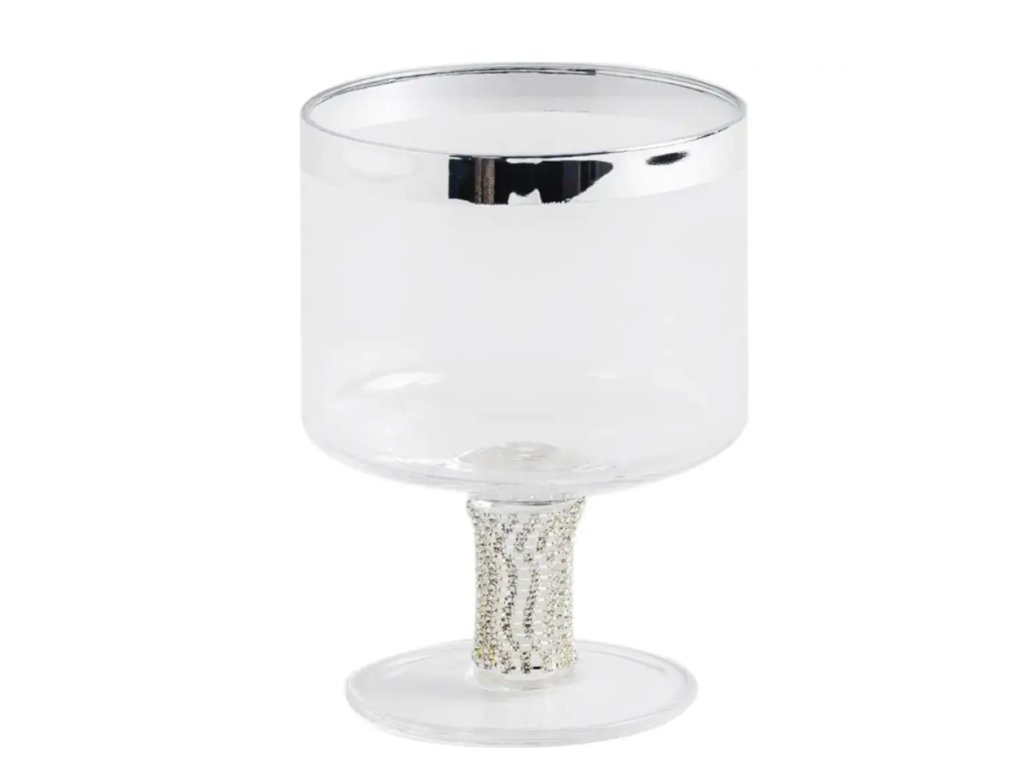 Elegantný pohár na dezert s jedinečným dizajnom. Je vyrobený z priehľadného skla s lesklým strieborným okrajom a pútavou nohou, ktorá je bohato zdobená trblietavými kamienkami. Ideálny na štýlové podávanie zmrzliny, parfaitov alebo ovocných pohárov. Tento pohár dodá každému stolu nádych luxusu a elegancie, vďaka čomu sa bežný dezert stane výnimočným zážitkom.