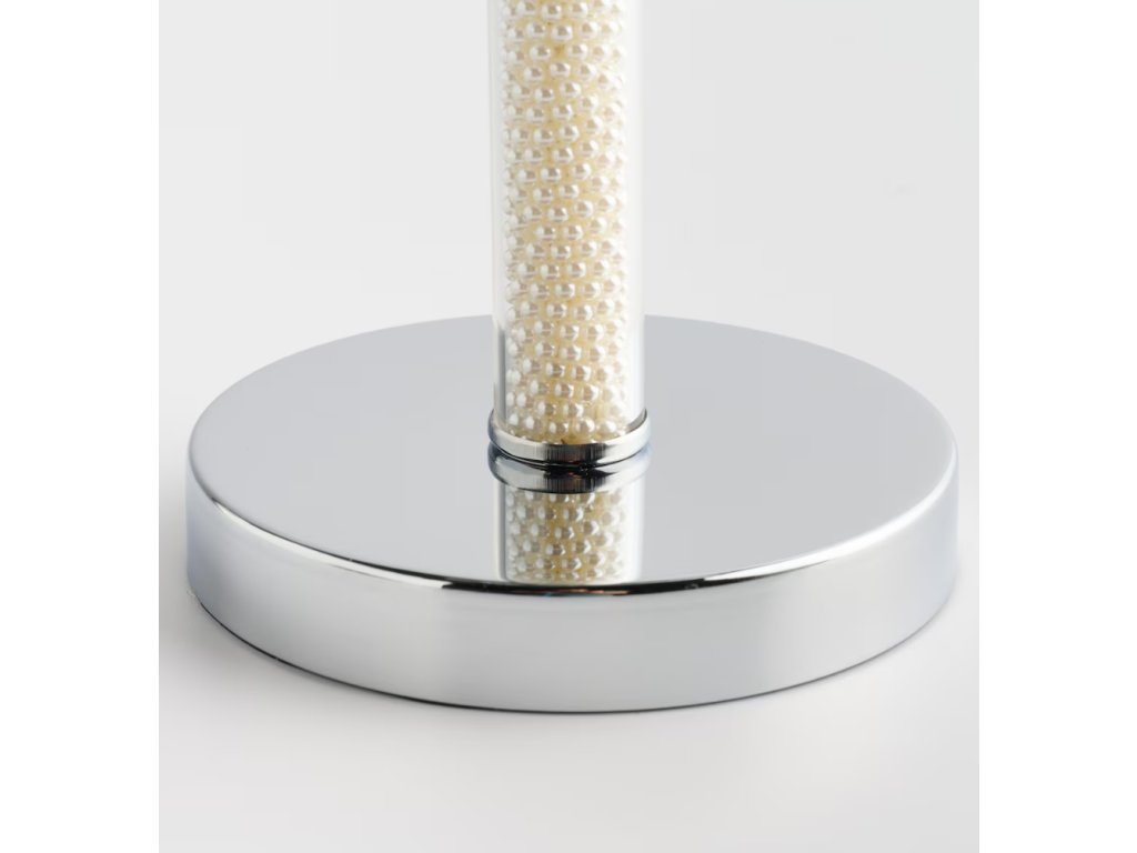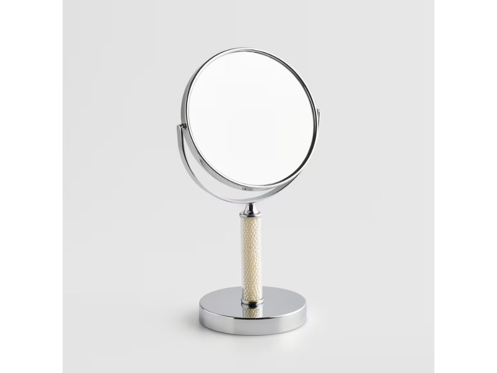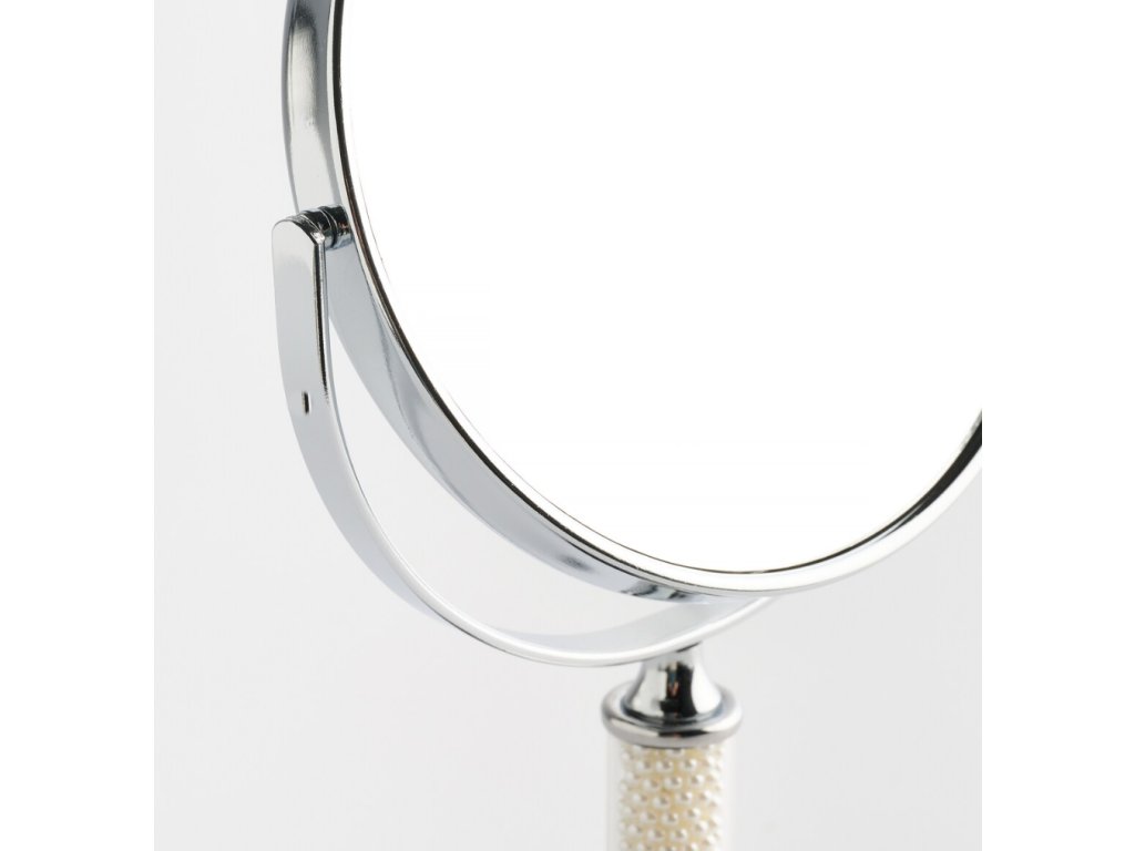 Pevná konštrukcia zrkadla Lucero je vyrobená z vysokokvalitného železa, čo zaručuje trvácnosť a stabilitu. Sklenená tabuľa poskytuje krištáľovo čistý odraz a chrómová povrchová úprava dodáva lesk a eleganciu. Nôžka zrkadla je zdobená drobnými bielymi perlami, ktoré mu dodávajú jedinečný charakter.