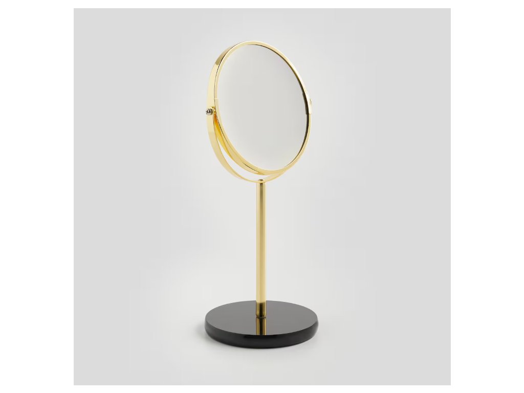Elegantné zrkadielko na nôžke z mramoru v klasickej čiernej farbe, s výškou 36 cm. Jeho výnimočný dizajn spája funkčnosť s luxusným štýlom a mramorový podstavec zabezpečuje stabilitu a trvácnosť. Je ideálne do kúpeľne, spálne alebo na toaletný stolík, predstavuje subtílnu ozdobu interiéru, vnášajúc do priestoru eleganciu a moderný nádych.
