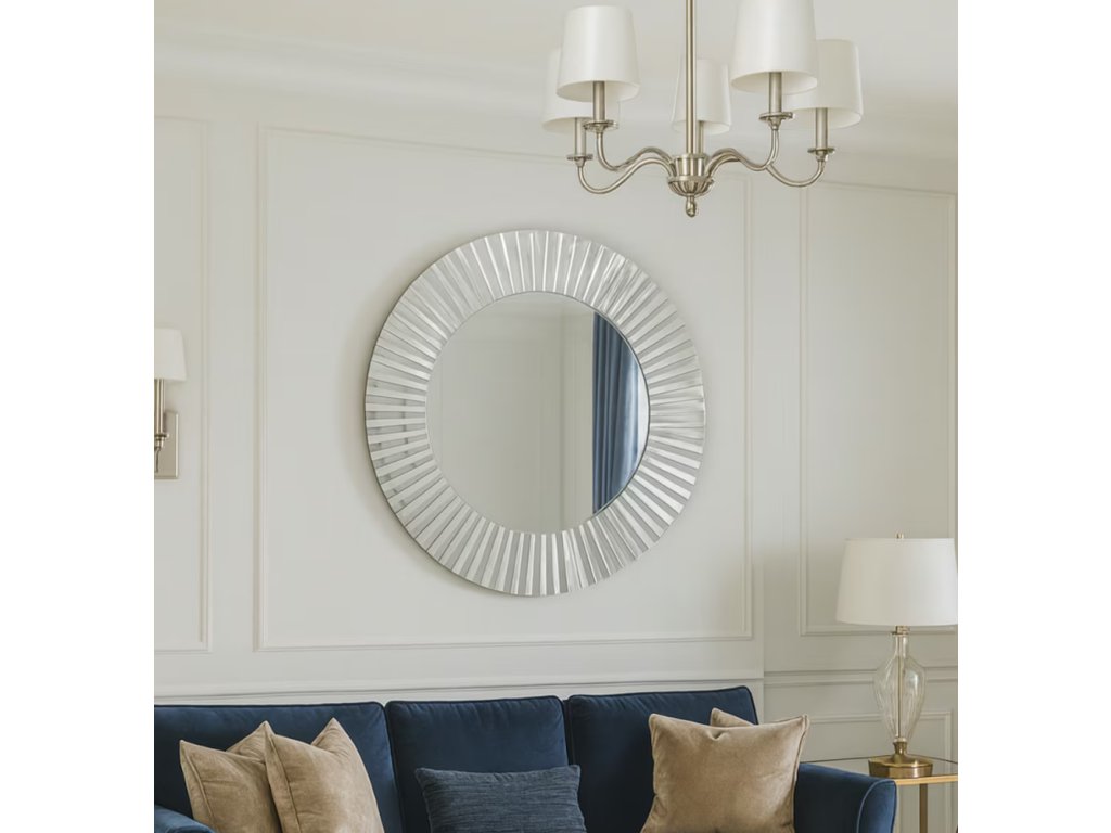 Toto impozantné okrúhle zrkadlo v štýle Glamour so svetlo striebornou povrchovou úpravou je skutočným stredobodom pozornosti. Jeho rám je zdobený jedinečnou razenou textúrou (plisovaným vzorom), ktorá je vytvorená zo segmentov so zrkadlovou úpravou. Tieto segmenty sú umiestnené do kruhu a pripomínajú slnečné lúče, čím vytvárajú fascinujúcu hru svetla a odleskov. S priemerom 76,3 cm nielen opticky zväčší priestor, ale vďaka svojmu lesklému, detailnému rámu vyrobenému z MDF, kovu a skla, dodá interiéru nádych luxusu a sofistikovanej elegancie. Je ideálne do obývačiek, predsiení alebo spální, kde chcete dosiahnuť wow efekt.